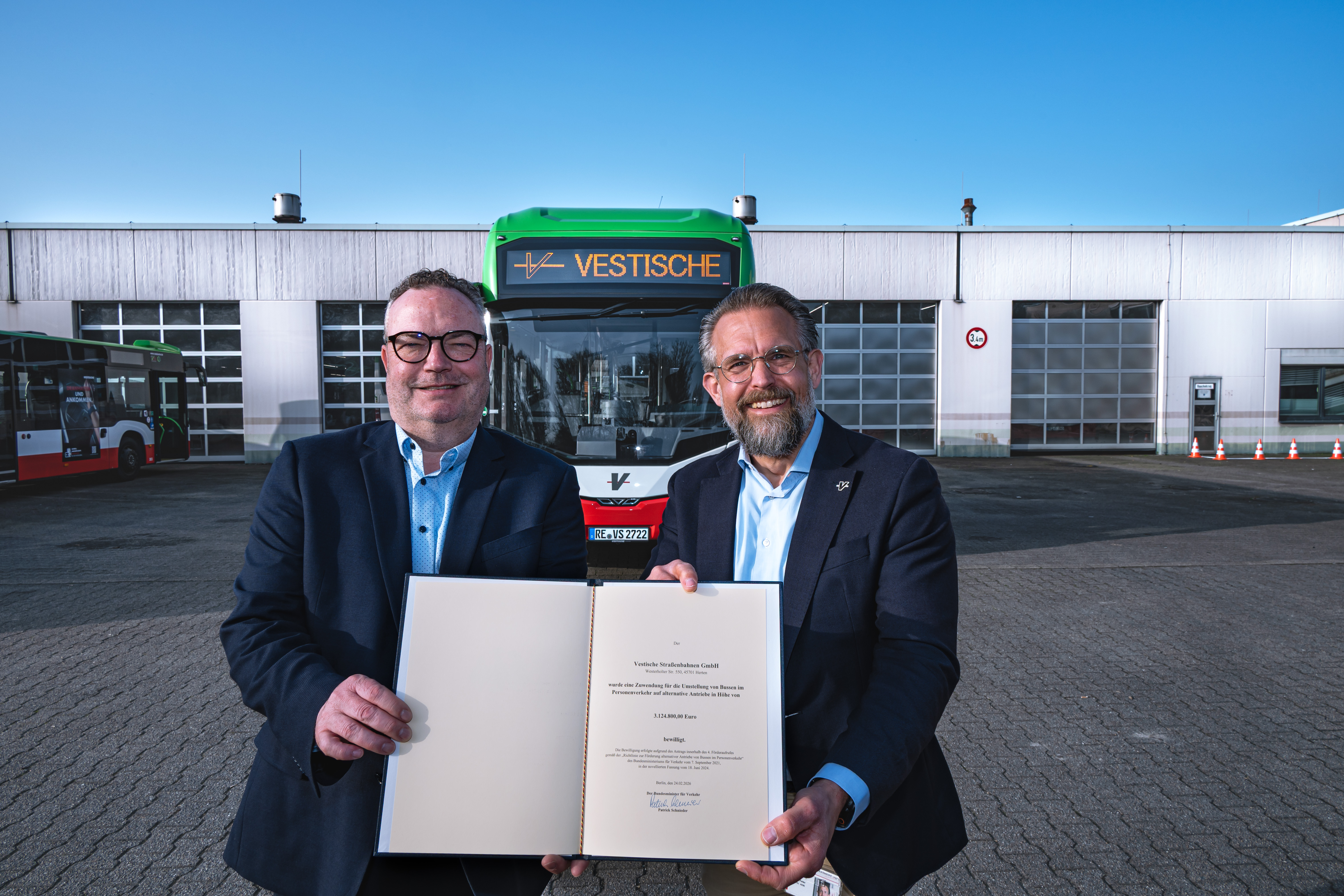 Verstärkung für die Wasserstoff-Flotte: Die Vestische hat den Förderbescheid des Bundesministeriums für Verkehr (BMV) in Höhe von rund 3,12 Millionen Euro zur Beschaffung von insgesamt 14 Brennstoffzellenbussen erhalten. Torsten Kastner, Centerleiter Technik, nahm die Förderurkunde am 24. Februar in Berlin aus den Händen von Bundesminister Patrick Schnieder entgegen.