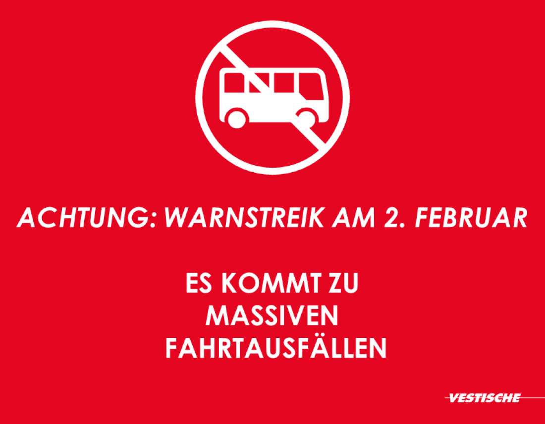 Aufgrund des kurzfristigen Streikaufrufs und technischer Betriebsabläufe ist es leider nicht möglich, die tatsächlichen Fahrten am 2. Februar in der Elektronischen Fahrplanauskunft und in der Vestische App abzubilden.