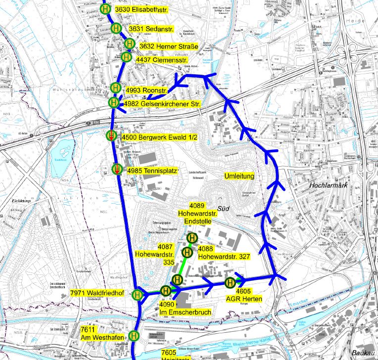 Die Busse der Linien SB 27 und NE 7 müssen daher in Fahrtrichtung Herten-Mitte großräumig umgeleitet werden. Die Haltestellen „Tennisplatz“ und „Bergwerk Ewald 1/2“ entfallen stadteinwärts, da sie sich auf dem gesperrten Teilstück befinden. Außerdem wird die Haltestelle „Waldfriedhof“ zur gleichnamigen Haltestelle in der Straße Emscherbruch verlegt. Die Vestische bittet ihre Fahrgäste auf die „Haltestelle Gelsenkirchener“ auszuweichen.