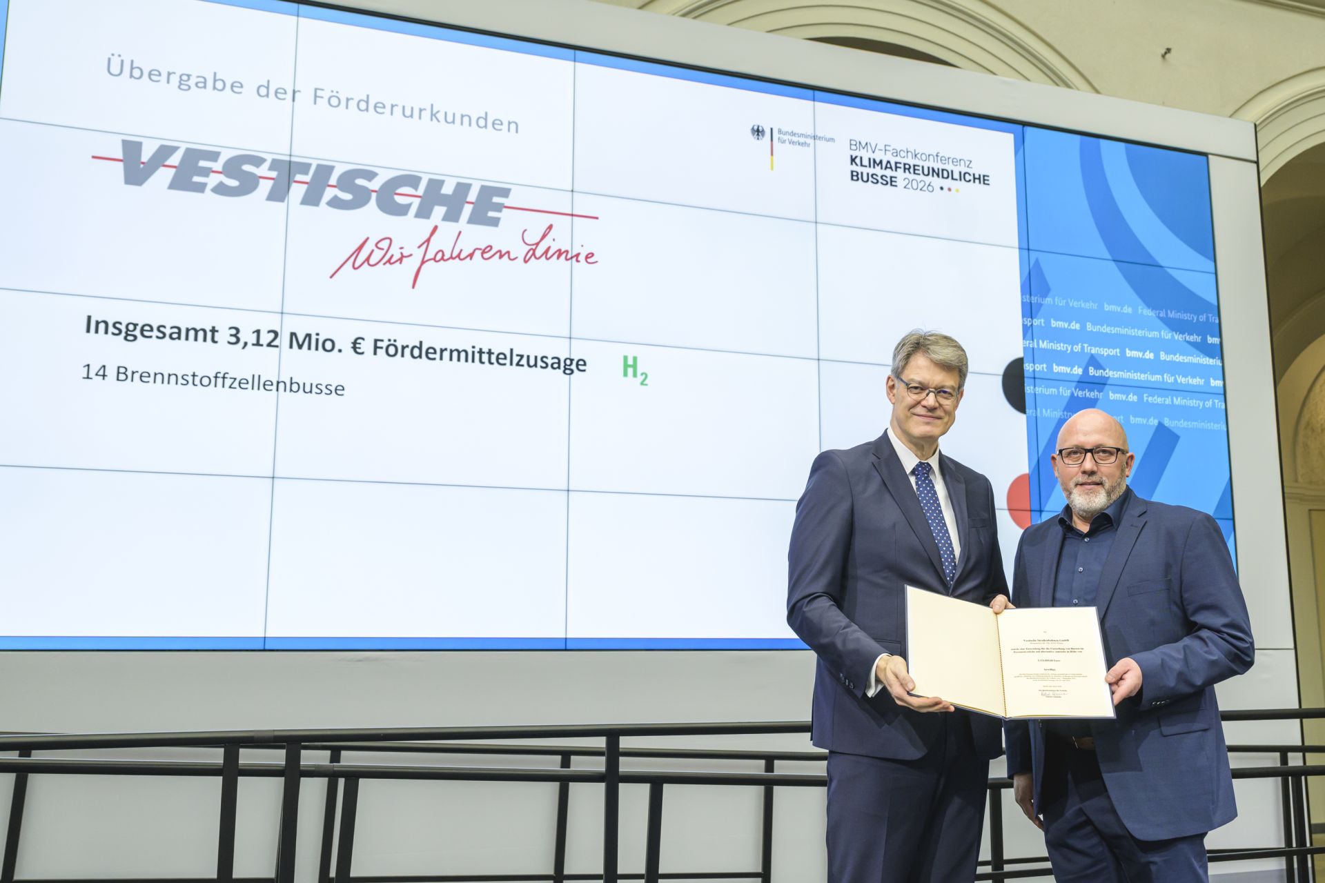 Verstärkung für die Wasserstoff-Flotte: Die Vestische hat den Förderbescheid des Bundesministeriums für Verkehr (BMV) in Höhe von rund 3,12 Millionen Euro zur Beschaffung von insgesamt 14 Brennstoffzellenbussen erhalten. Torsten Kastner, Centerleiter Technik, nahm die Förderurkunde am 24. Februar in Berlin aus den Händen von Bundesminister Patrick Schnieder entgegen.